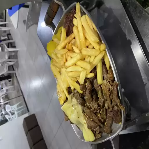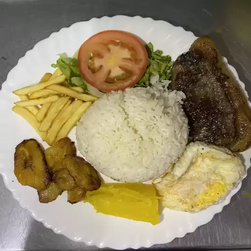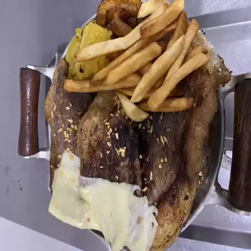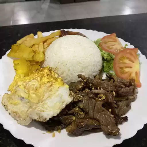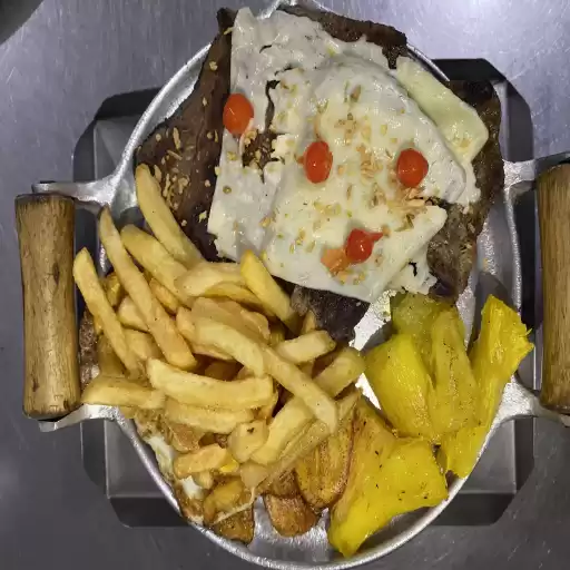 120G DE TIRAS DE FILE MIGNON GRELHADO NA MANTEIGA COM CEBOLA, OVO, BANANA, QUEIJO, MOLHO DA CASA, ALAFCE, TOMATE.