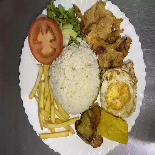 Acompanha: (150g file de frango), arroz, batata frita, banana, ovo, salada, fa... Ver completo
